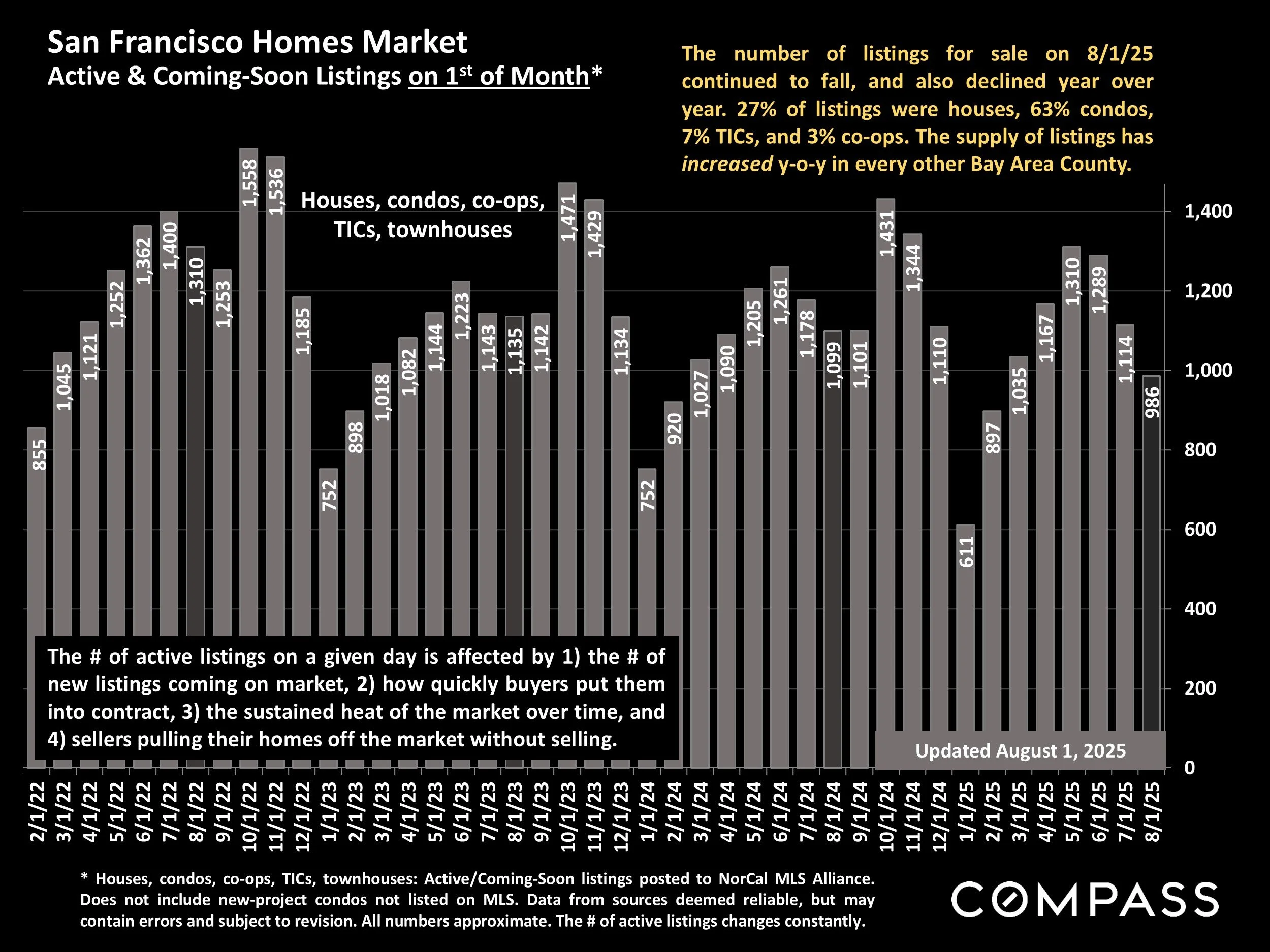 The number of listings for sale on 8/1/25 continued to fall, and also declined year over year. 27% of listings were houses, 63% condos, 7% TICs, and 3% co-ops. The supply of listings has increased y-o-y in every other Bay Area County.