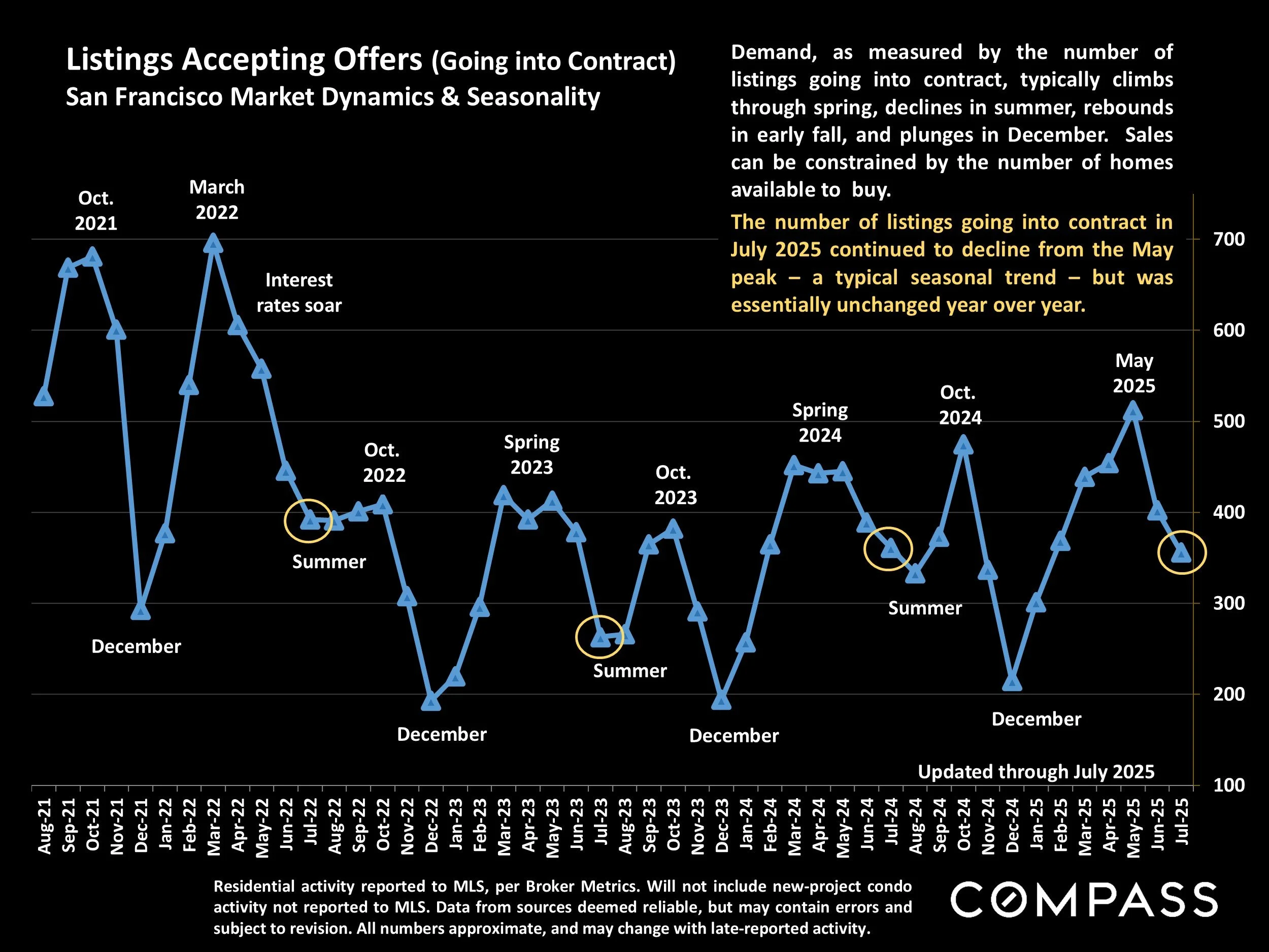 The number of listings going into contract in July 2025 continued to decline from the May peak – a typical seasonal trend – but was essentially unchanged year over year.