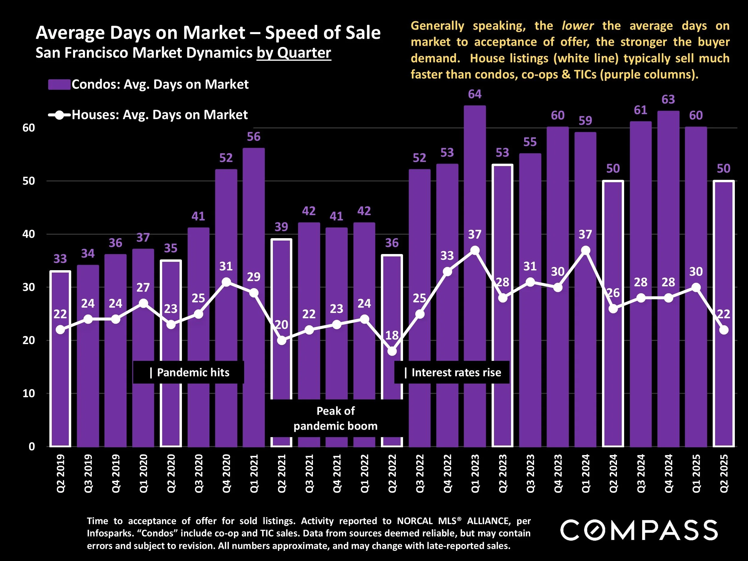 Time to acceptance of offer for sold listings. Activity reported to NORCAL MLS® ALLIANCE, per Infosparks. “Condos” include co-op and TIC sales. Data from sources deemed reliable, but may contain errors and subject to revision. All numbers approximate, and may change with late-reported sales.