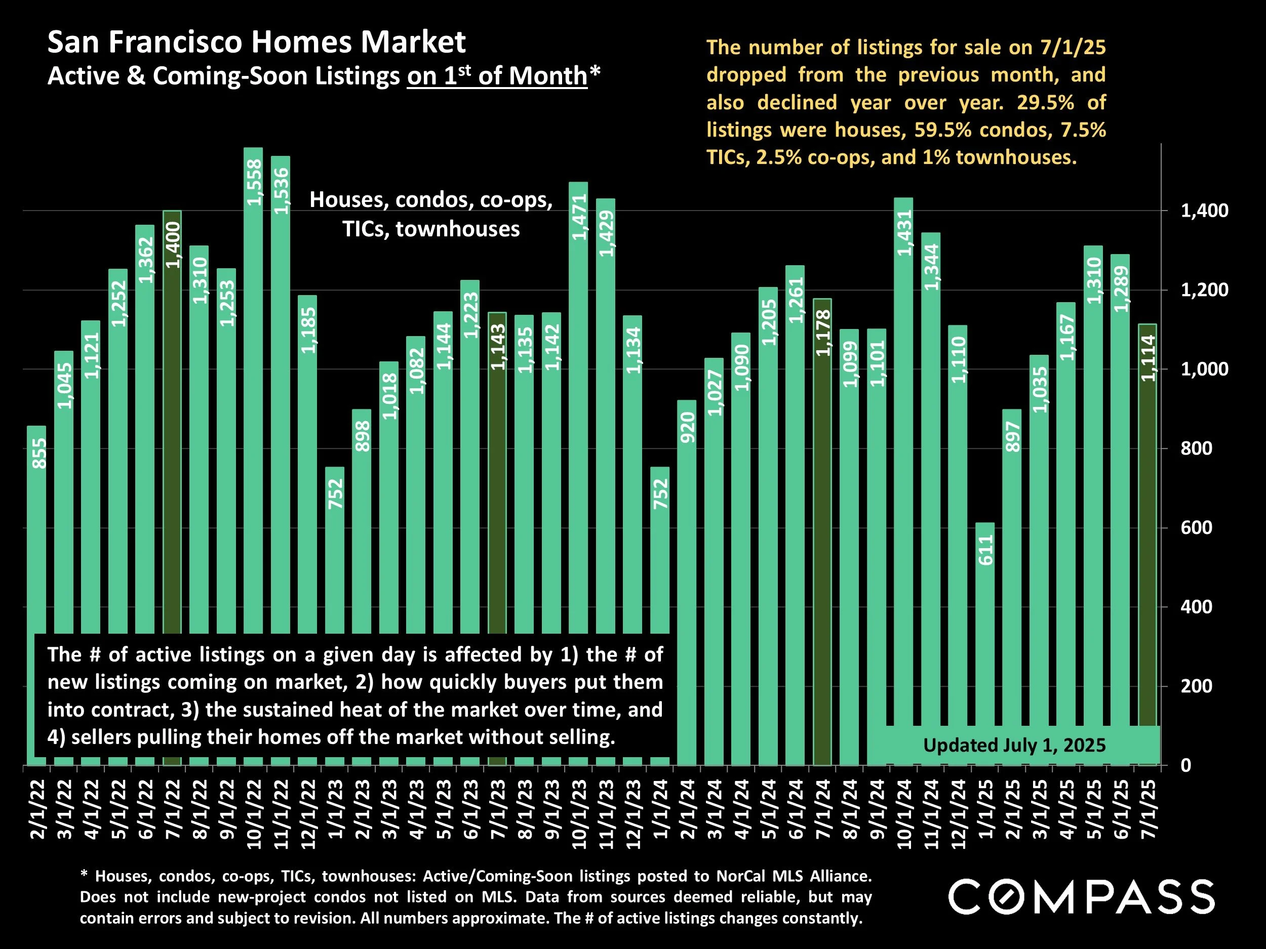 The number of listings for sale on 7/1/25 dropped from the previous month, and also declined year over year. 29.5% of listings were houses, 59.5% condos, 7.5% TICs, 2.5% co-ops, and 1% townhouses.
