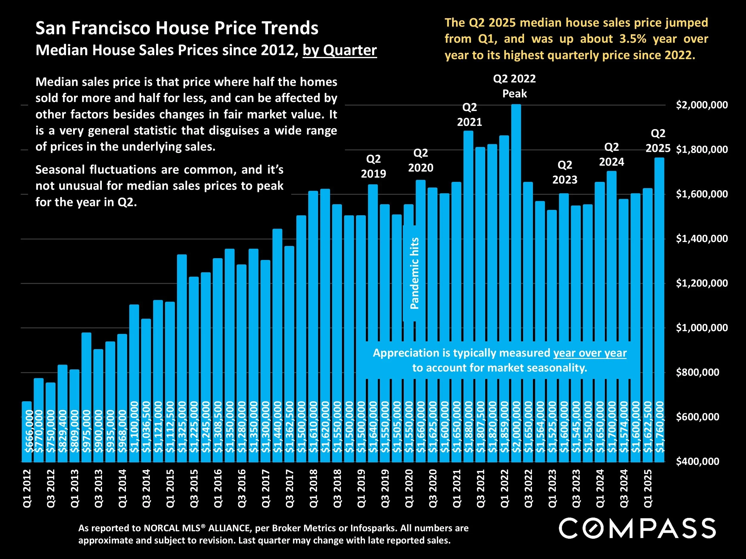 The Q2 2025 median house sales price jumped from Q1, and was up about 3.5% year over year to its highest quarterly price since 2022.