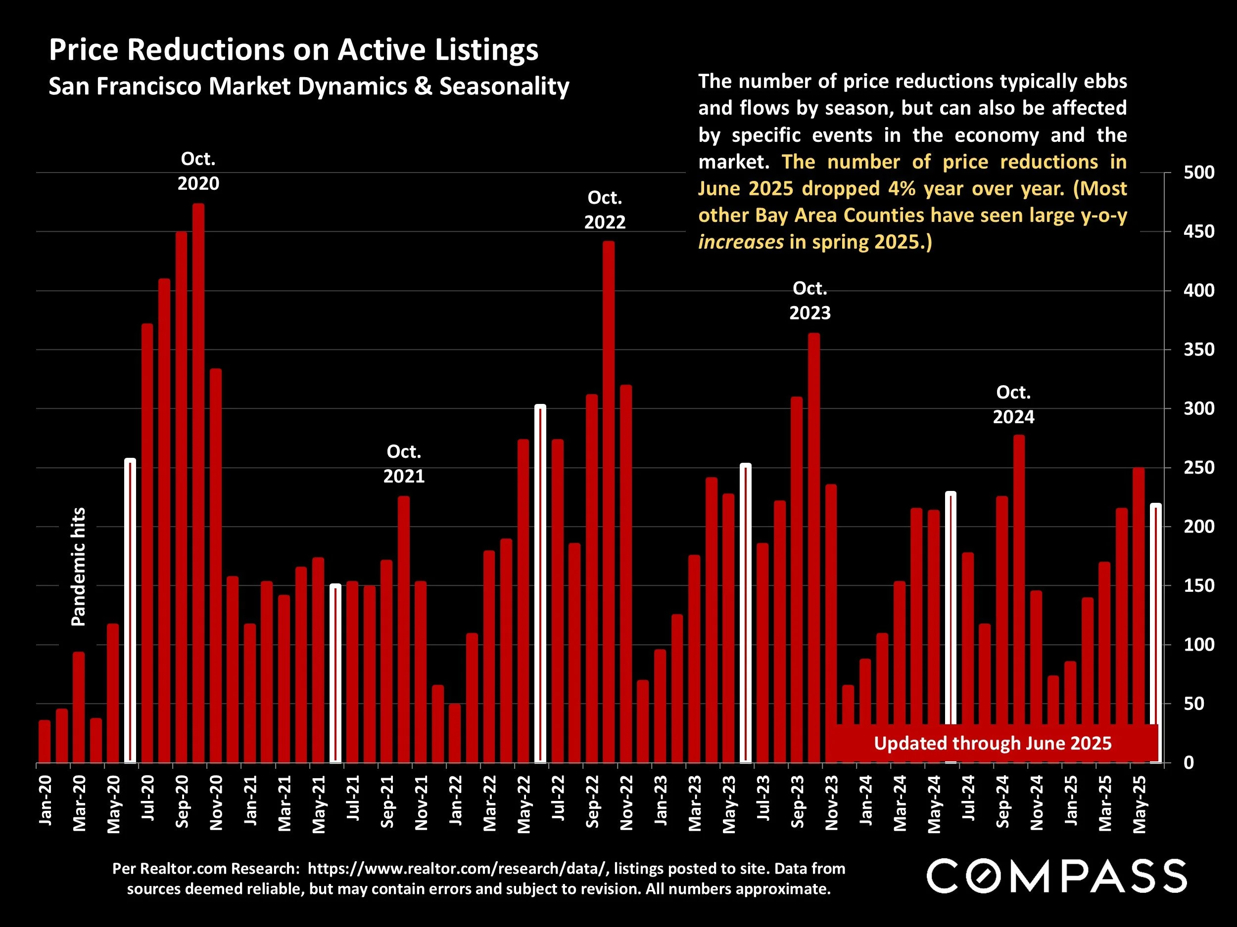 The number of price reductions typically ebbs and flows by season, but can also be affected by specific events in the economy and the market. The number of price reductions in June 2025 dropped 4% year over year. (Most other Bay Area Counties have seen large YOY increases in spring 2025.)