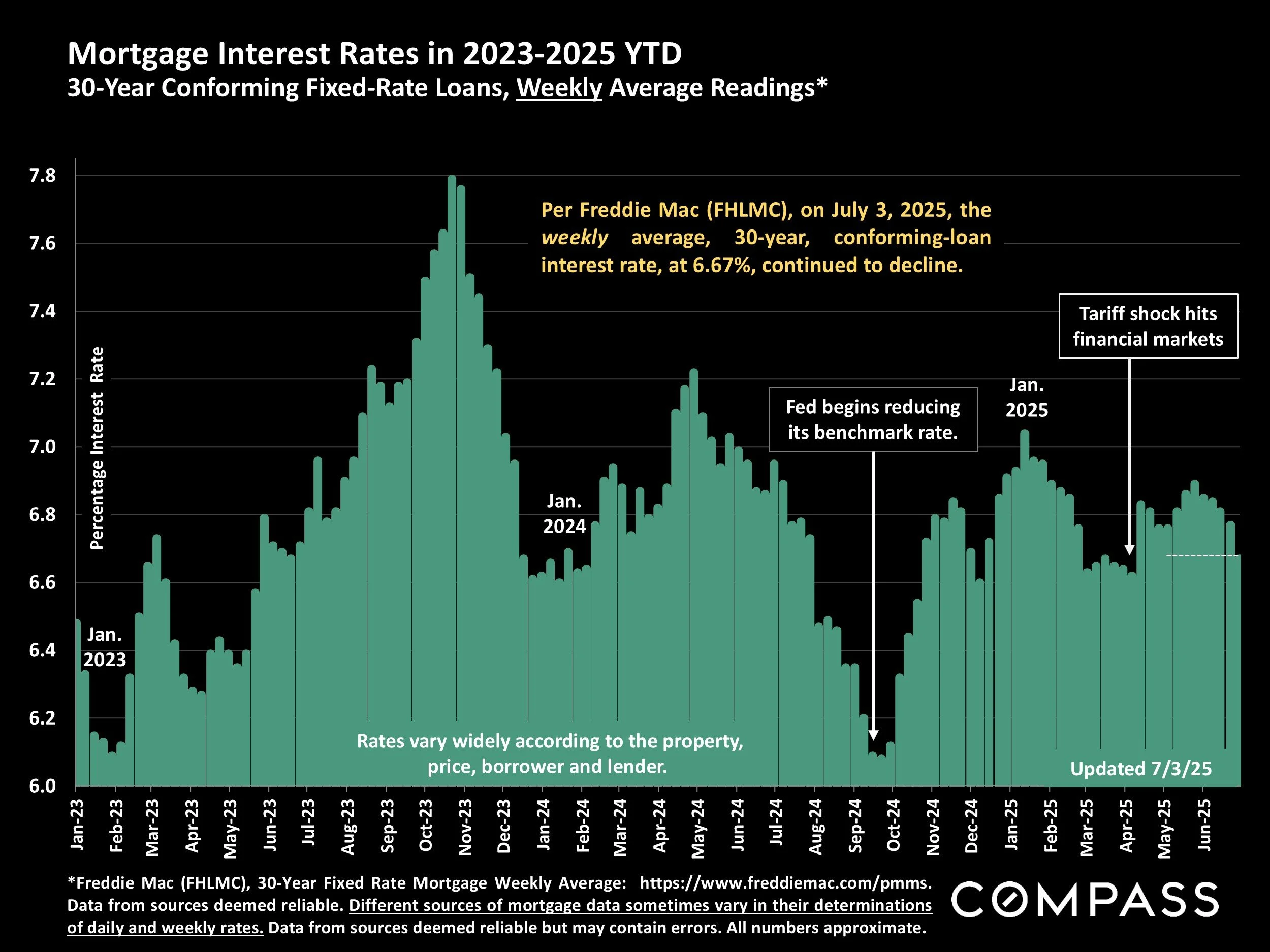 Per Freddie Mac (FHLMC), on July 3, 2025, the weekly average, 30-year, conforming-loan interest rate, at 6.67%, continued to decline.