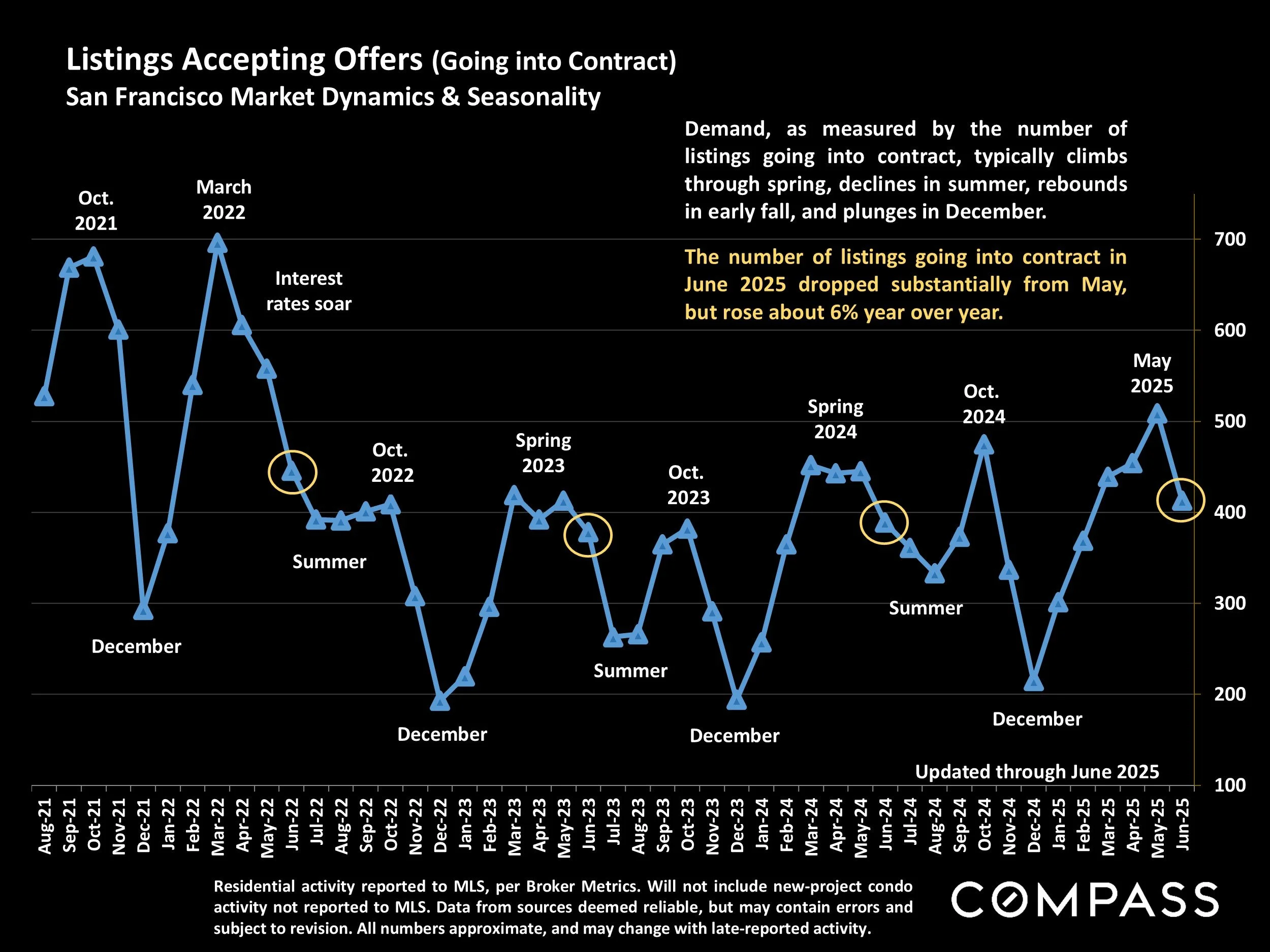 The number of listings going into contract in June 2025 dropped substantially from May, but rose about 6% year over year.