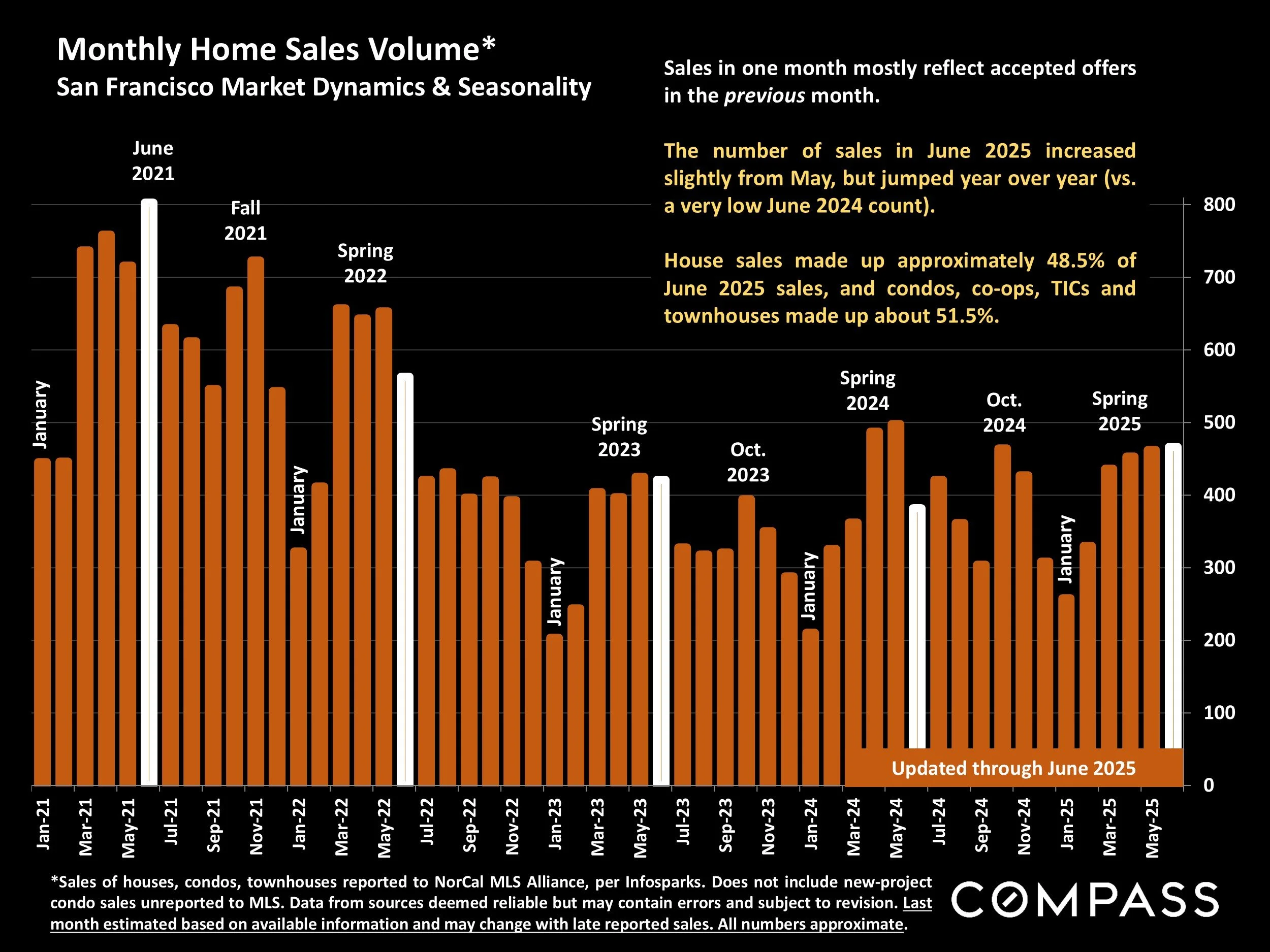 House sales made up approximately 48.5% of June 2025 sales, and condos, co-ops, TICs and townhouses made up about 51.5%.