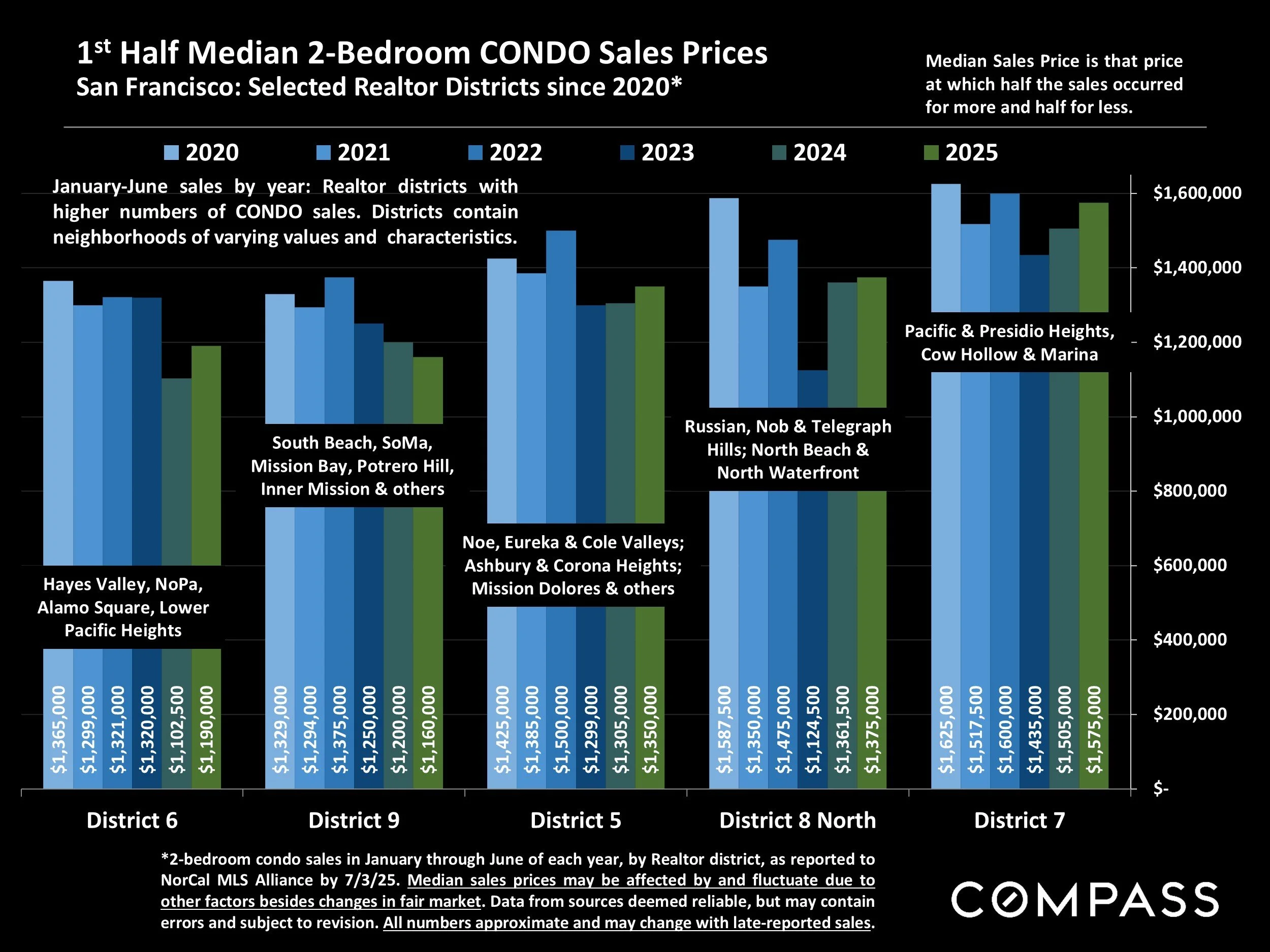 *2-bedroom condo sales in January through June of each year, by Realtor district, as reported to NorCal MLS Alliance by 7/3/25. Median sales prices may be affected by and fluctuate due to other factors besides changes in fair market. Data from sources deemed reliable, but may contain errors and subject to revision. All numbers approximate and may change with late-reported sales.