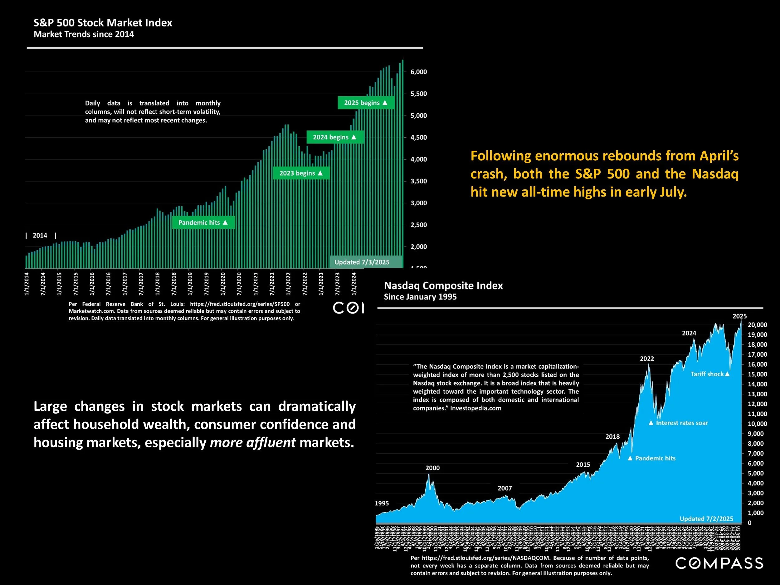 Following enormous rebounds from April’s crash, both the S&P 500 and the Nasdaq hit new all-time highs in early July. Large changes in stock markets can dramatically affect household wealth, consumer confidence and housing markets, especially more affluent markets.