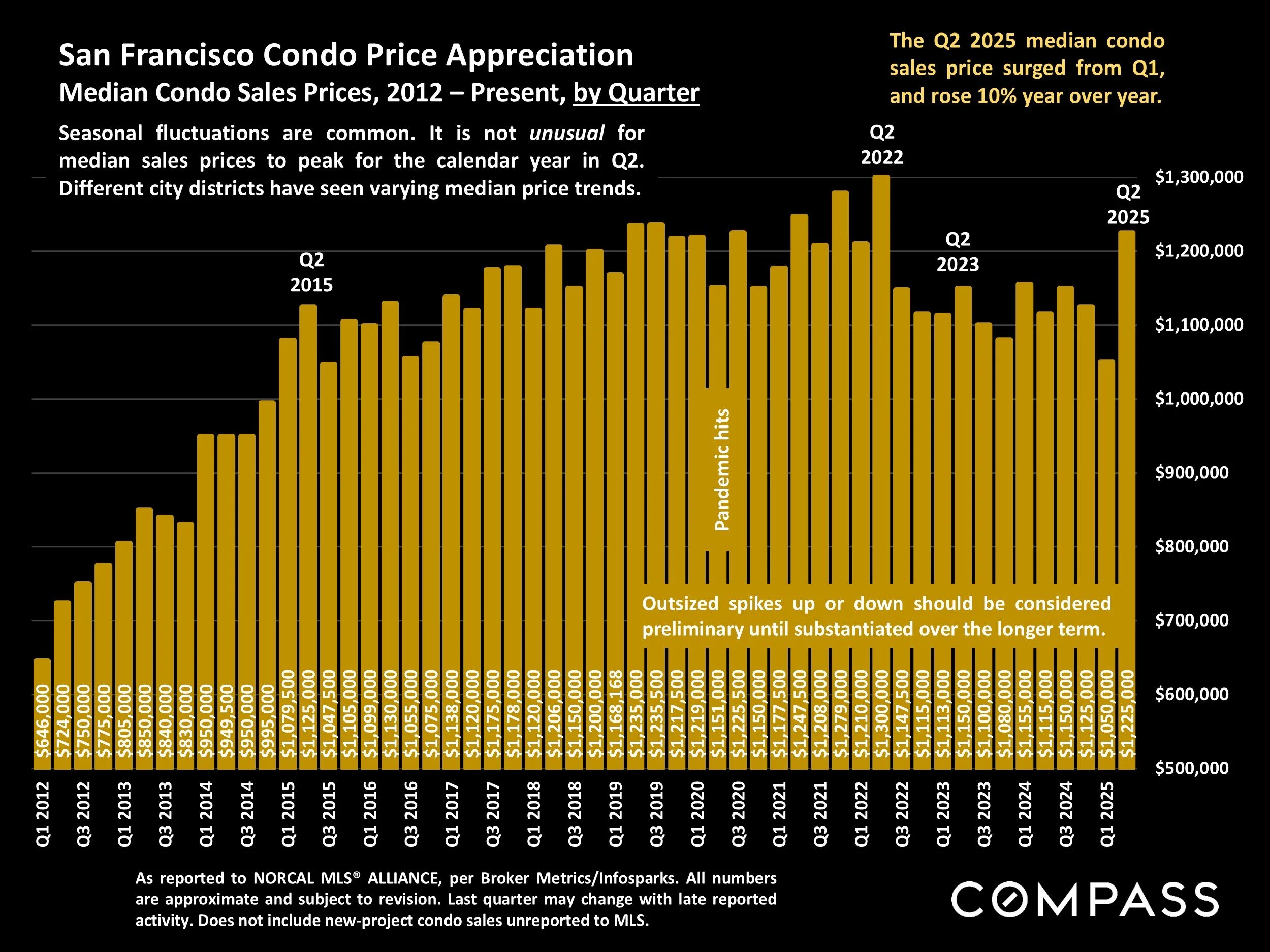 The Q2 2025 median condo sales price surged from Q1, and rose 10% year over year.
