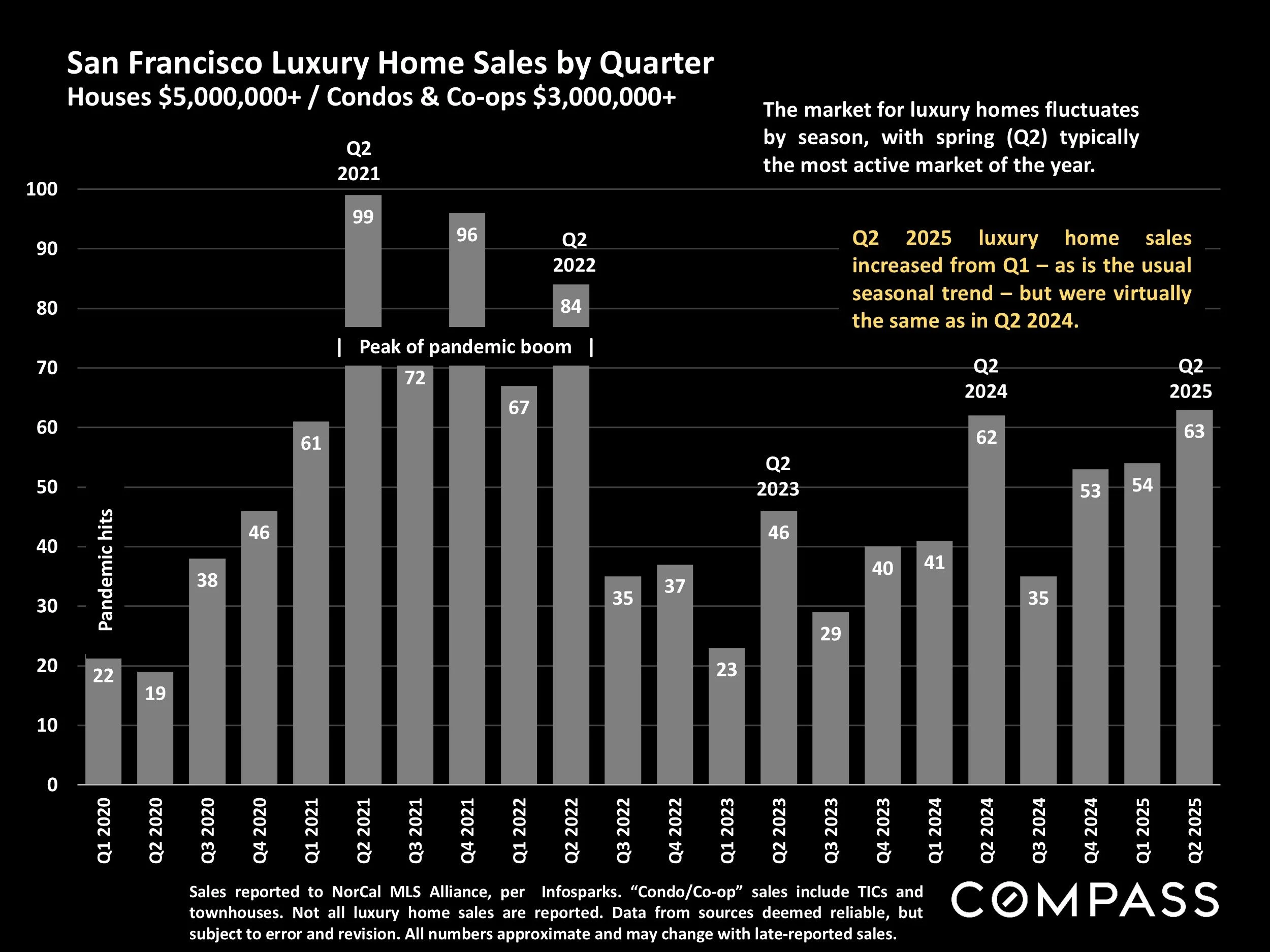 Q2 2025 luxury home sales increased from Q1 – as is the usual seasonal trend – but were virtually the same as in Q2 2024.