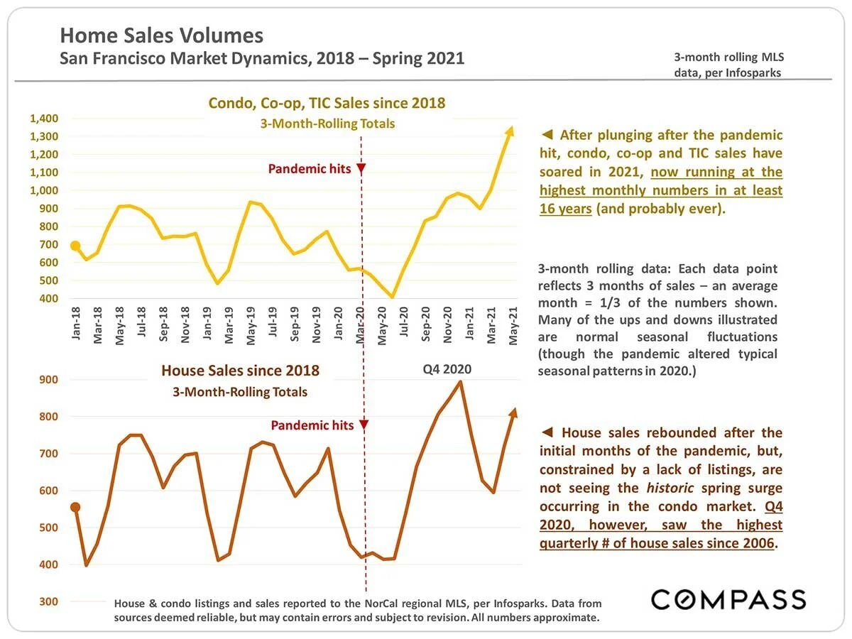 In Spring 2021, sales reported to MLS of luxury condos, co-ops and TICs — those selling for $2 million & above — hit their highest point ever: 50% above the previous peak in Spring 2018.