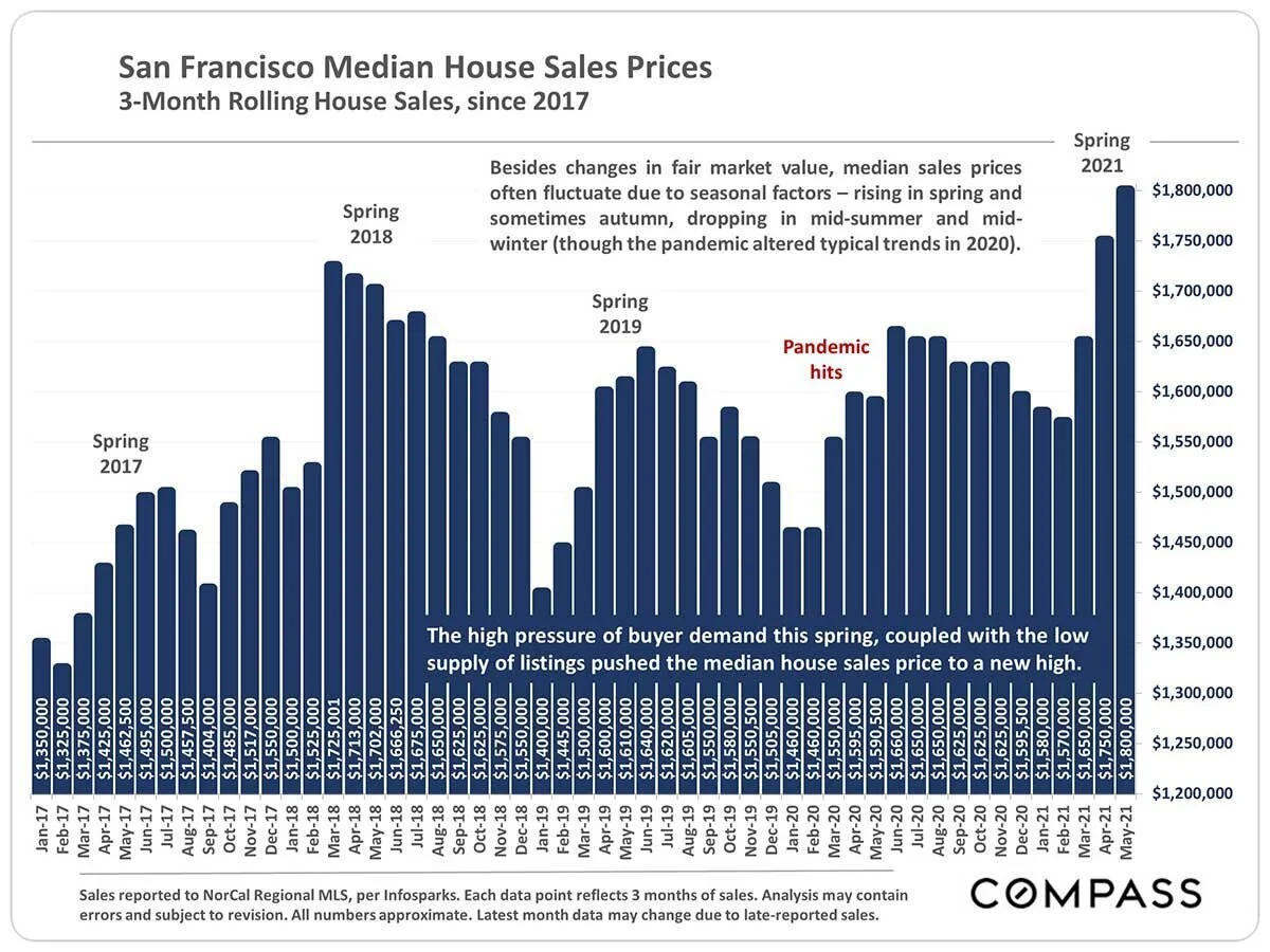 Median sales prices often fluctuate due to seasonal factors, rising in spring and autumn, dropping in mid-winter. With the pandemic-drop in prices and the rollout of vaccines, Buyers appear to see SF condos as a buying opportunity. Sales volume and prices are now jumping.