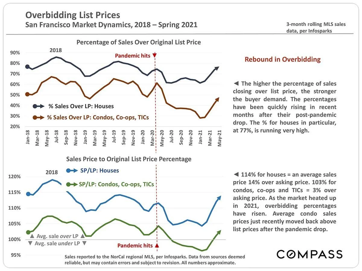 114% for houses = an average sales price 14% over asking price. 103% for condos, co-ops and TICs = 3% over asking price. As the market heated up in 2021, overbidding percentages have risen. Average condo sales prices just recently moved back above list prices after the pandemic drop.