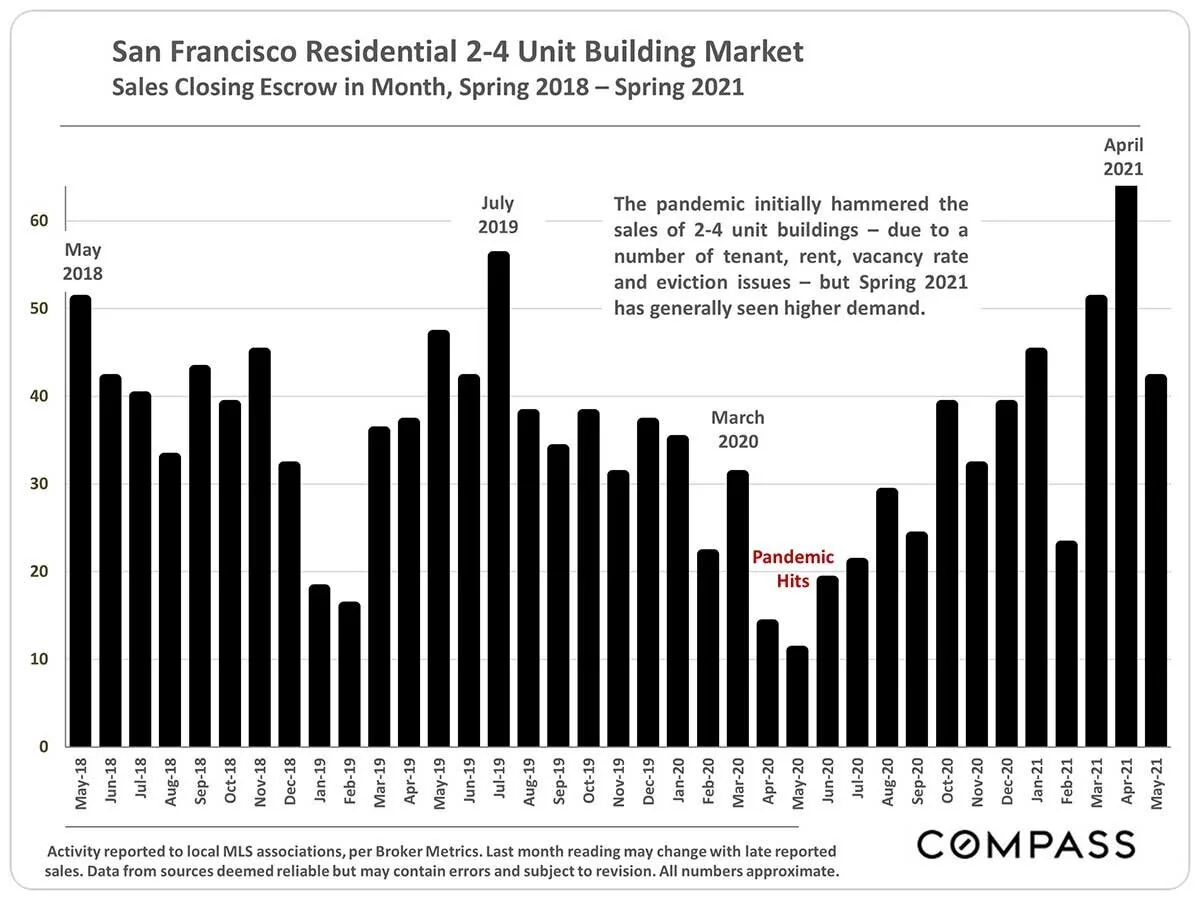 The pandemic initially hammered the 2019 sales of 2-4 unit buildings — due to a number of tenant, rent, vacancy rate and eviction issues — but Spring 2021 has generally seen higher demand.