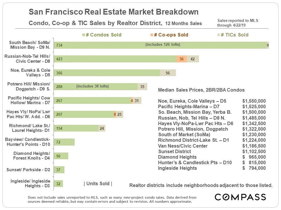 Condo sales in SF run across a wide range of eras and styles, from Victorian and Edwardian units in small buildings, through brand new, ultra-luxury high-rise penthouses. The breakout of median sales prices pertain to 2-bedroom, 2 bath condos only.