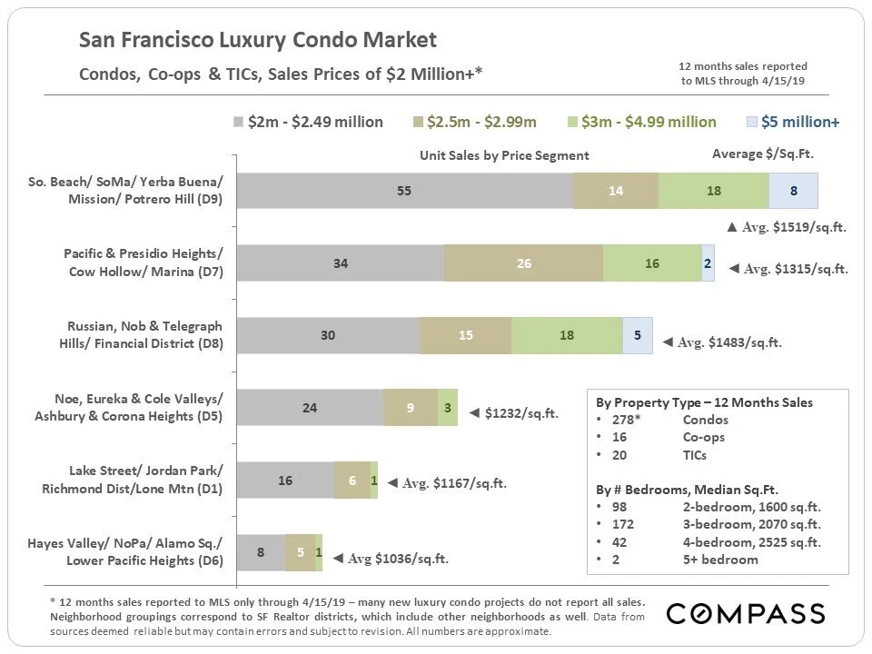Luxury condo sales are concentrated in 3 districts: District 9, where most of the newer, high-rise, luxury projects are found in the South Beach/Yerba Buena area (which 30 years ago was filled with parking lots and auto-stereo shops), and in the old-prestige, northern neighborhoods of Districts 7 & 8, which include Pacific Heights and Russian Hill. (This is also where the city's high-price co-op units are clustered).