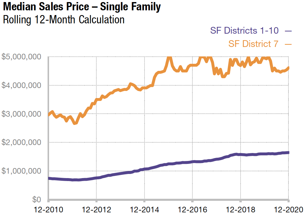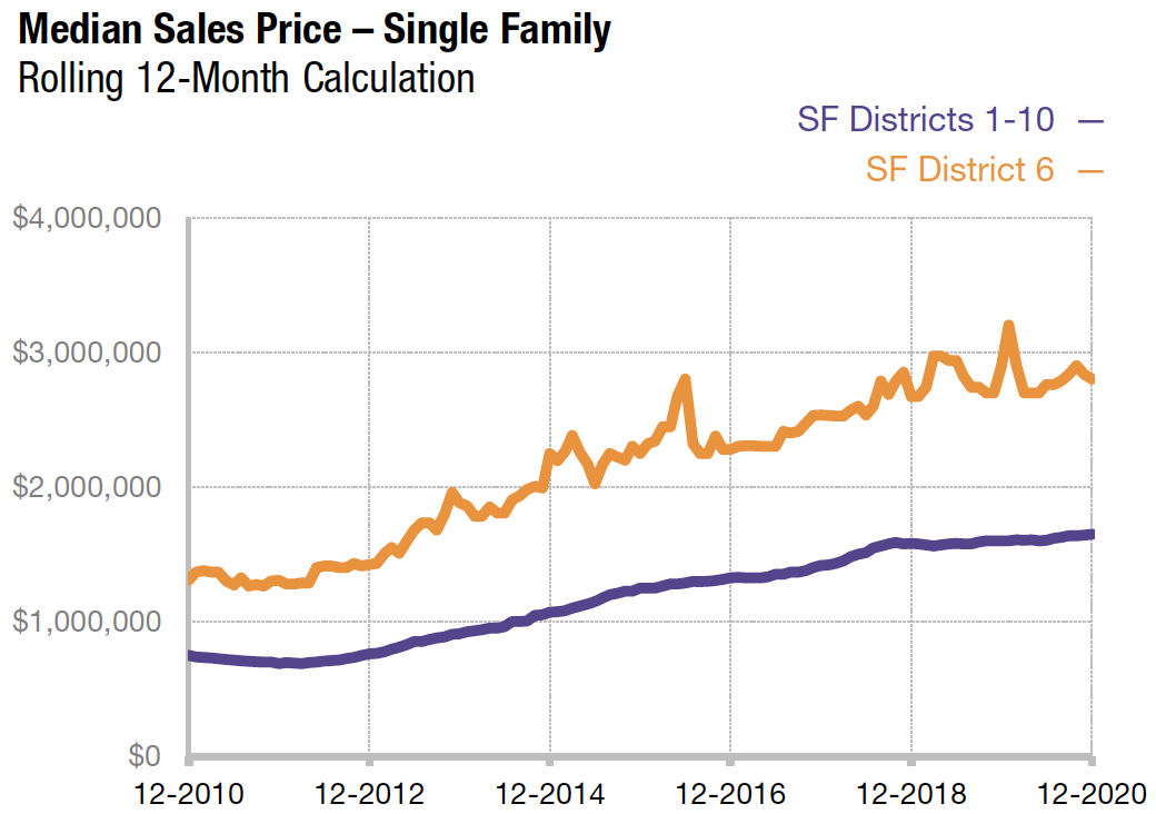 This map and the list following generally reflect 2020 median home sales prices and average dollar per square foot values in San Francisco neighborhoods. (Actually, it includes sales through 1/20/21.) Median sales prices are generalities that often fluctuate and can be affected by other factors besides changes in fair market value. They typically disguise a huge range of prices in the underlying individual sales, and all prices should be considered approximate. It is impossible to know how median and average value statistics apply to any particular home without a specific comparative market analysis. Data per sales reported to MLS, deemed reliable, but may contain errors and subject to revision.