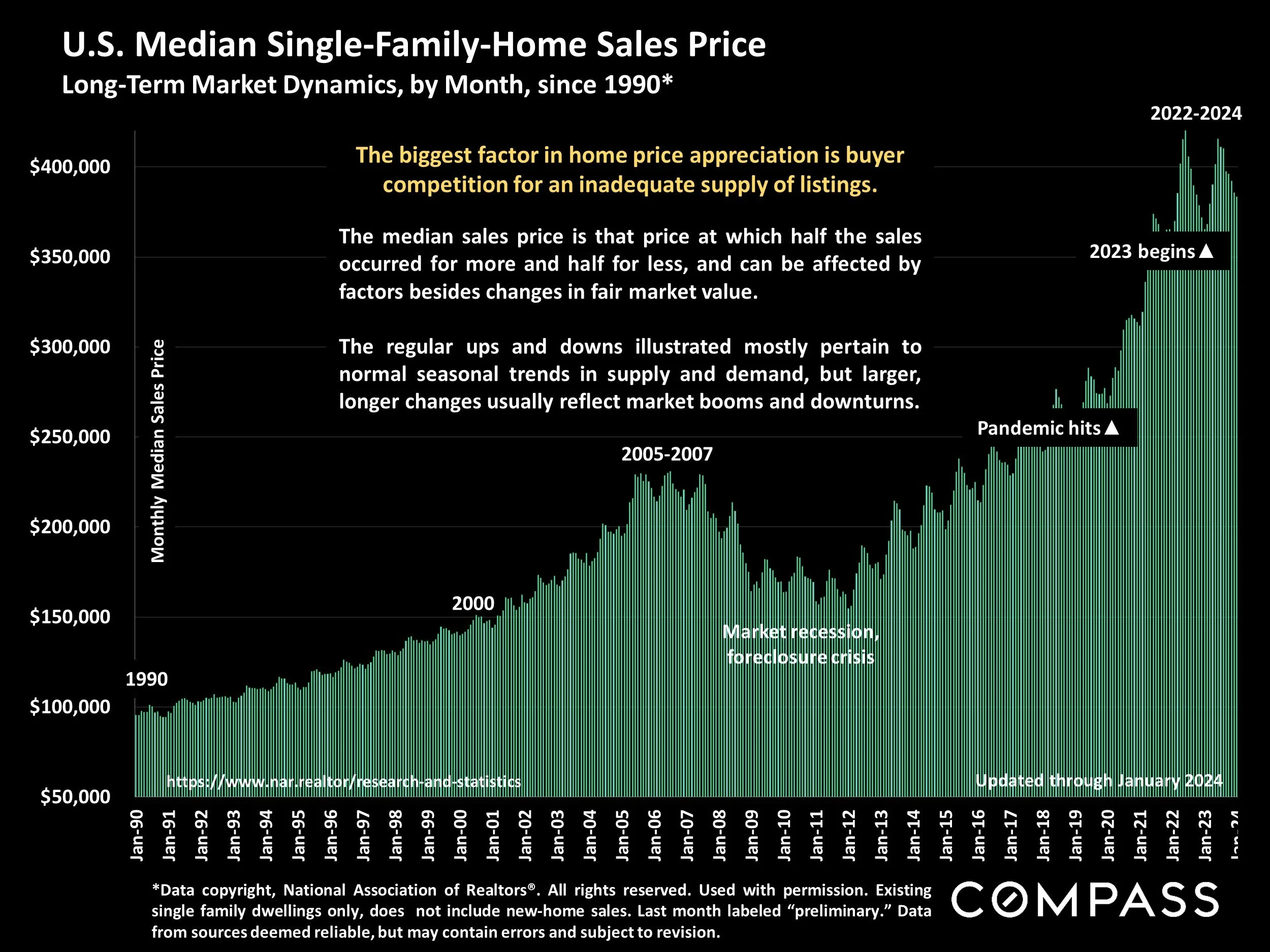 The balance between supply and demand is continually shifting – sometimes subtly and sometimes very dramatically – due to a wide range of changing economic and demographic conditions, but, generally speaking, since the market recovery in 2012-2013, demand has increasingly and severely outpaced supply. Even after interest rates rose in 2022, significantly depressing buyer demand, by 2023, the supply of listings unexpectedly declined as much or more, renewing upward pressure on national home prices.