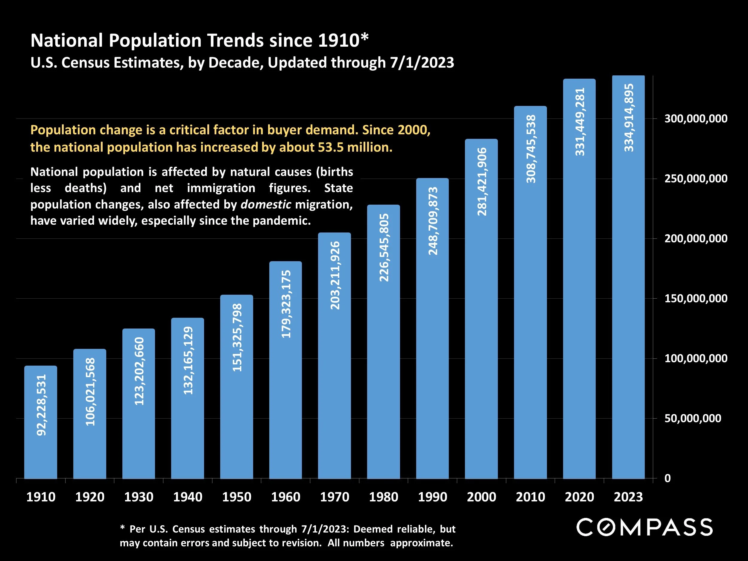 Population change is a critical factor in buyer demand. Since 2000, the national population has increased by about 53.5 million.