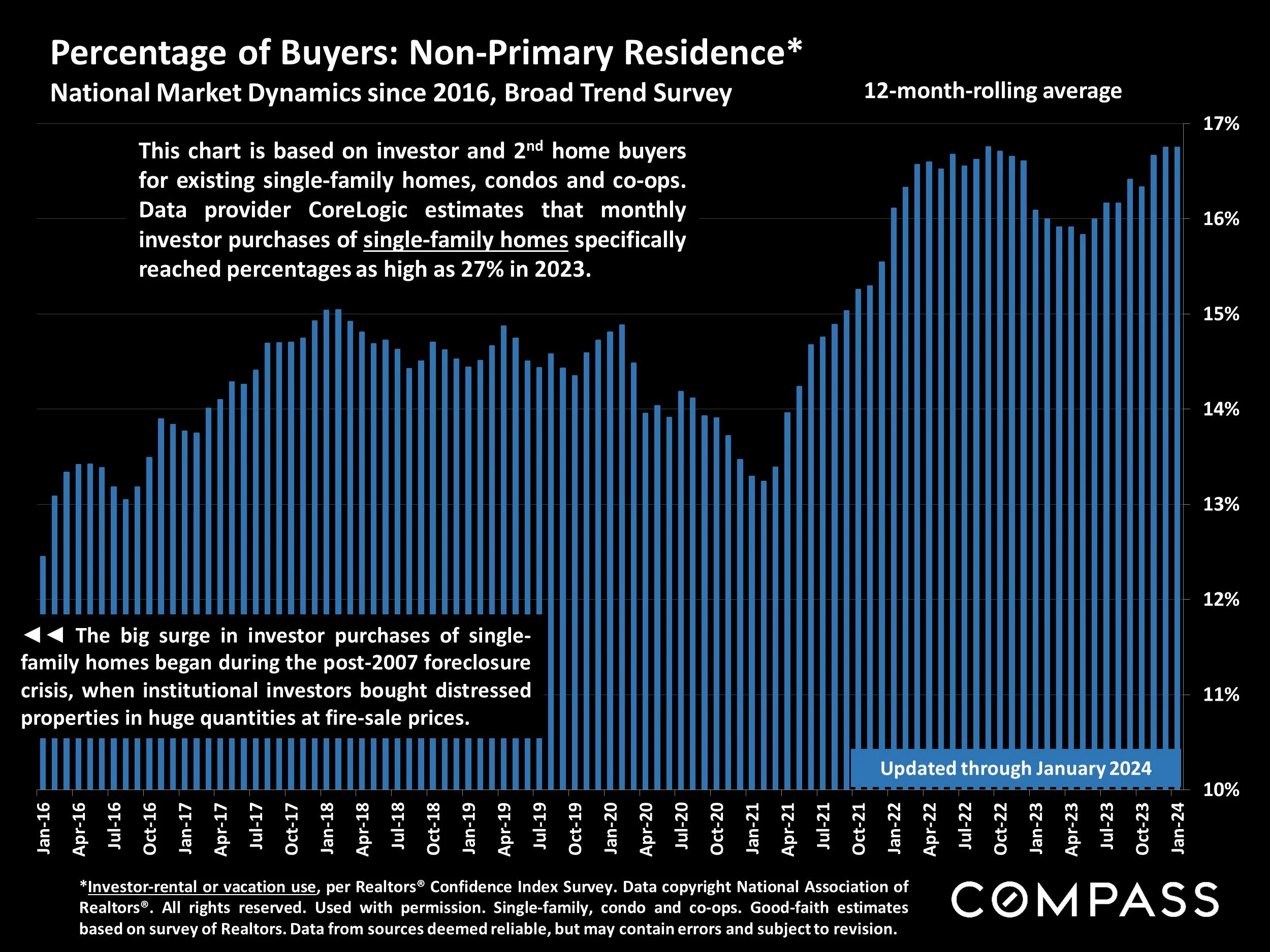 This chart is based on investor and 2nd home buyers for existing single-family homes, condos and co-ops. Data provider CoreLogic estimates that monthly investor purchases of single-family homes specifically reached percentages as high as 27% in 2023.