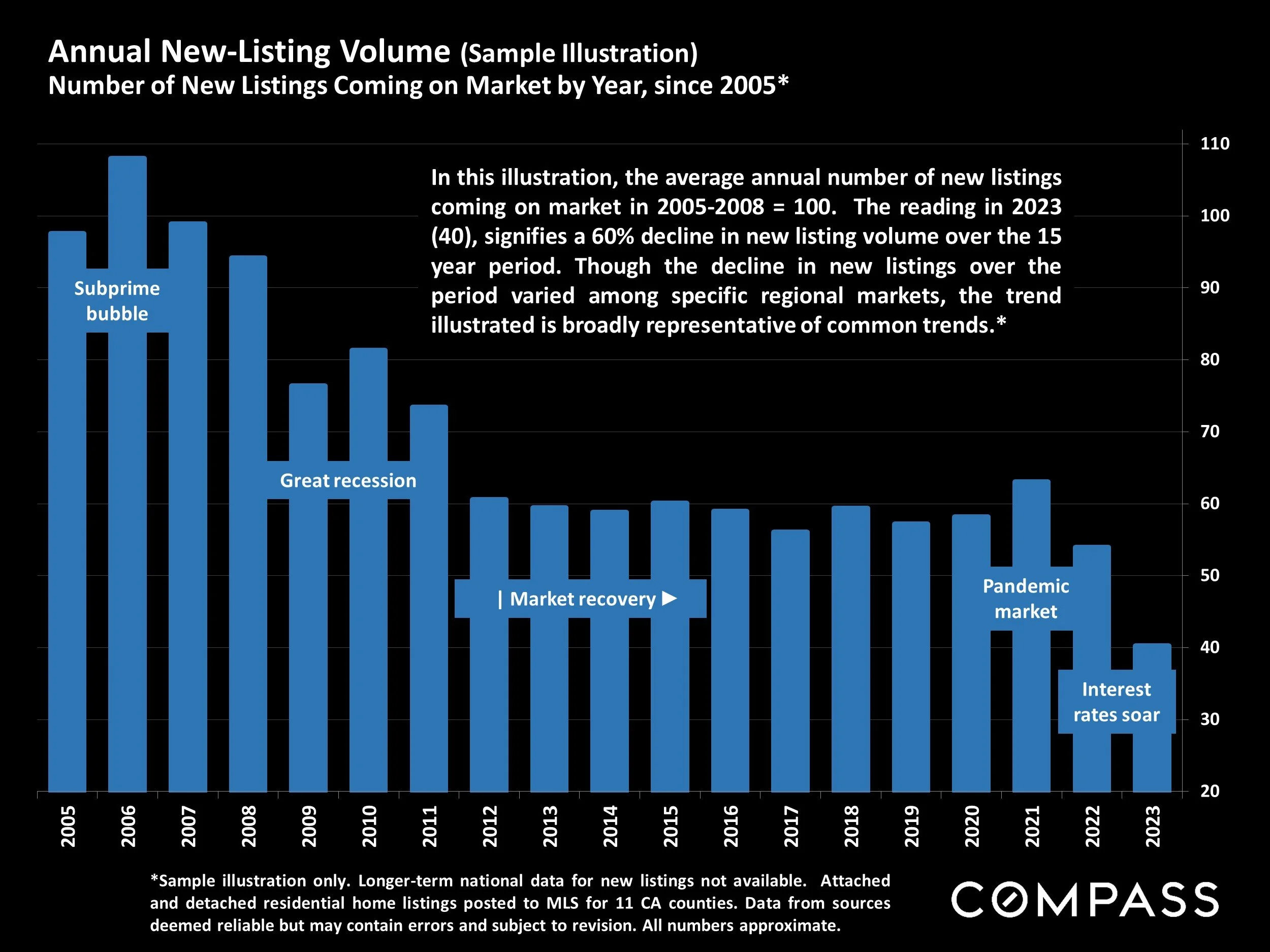 In this illustration, the average annual number of new listings coming on market in 2005-2008 = 100. The reading in 2023 (40), signifies a 60% decline in new listing volume over the 15 year period. Though the decline in new listings over the period varied among specific regional markets, the trend illustrated is broadly representative of common trends.*