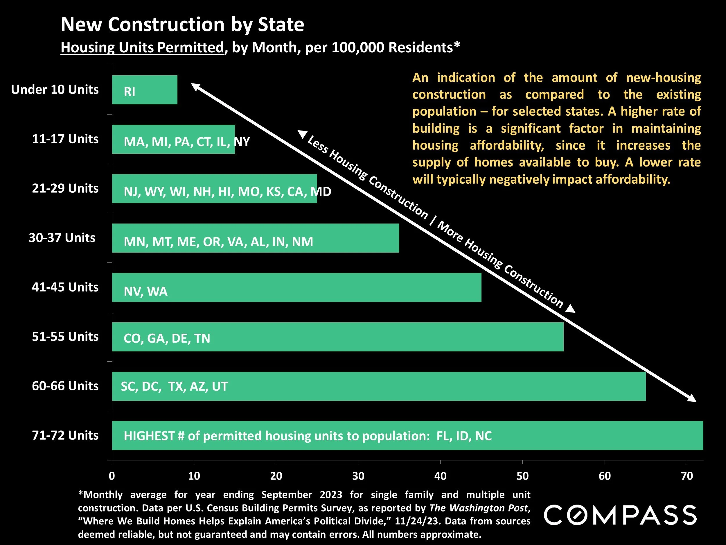 *Monthly average for year ending September 2023 for single family and multiple unit construction. Data per U.S. Census Building Permits Survey, as reported by The Washington Post, “Where We Build Homes Helps Explain America’s Political Divide,” 11/24/23. Data from sources deemed reliable, but not guaranteed and may contain errors. All numbers approximate.