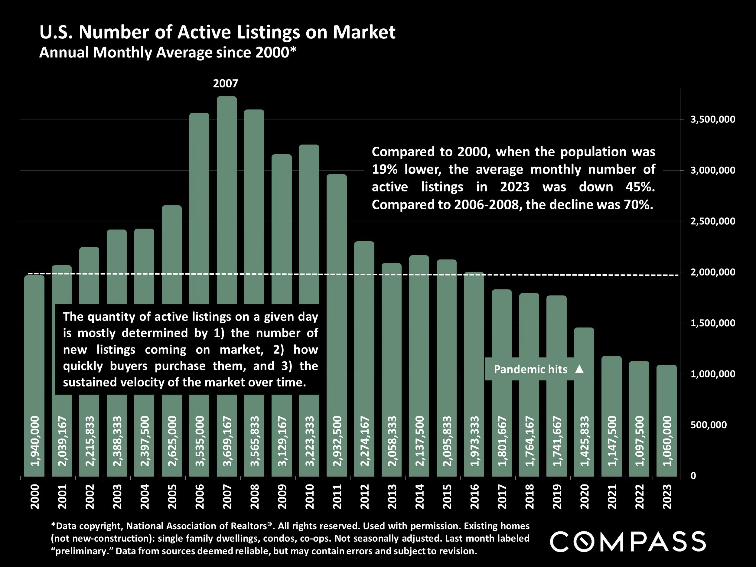 Compared to 2000, when the population was 19% lower, the average monthly number of active listings in 2023 was down 45%. Compared to 2006-2008, the decline was 70%.