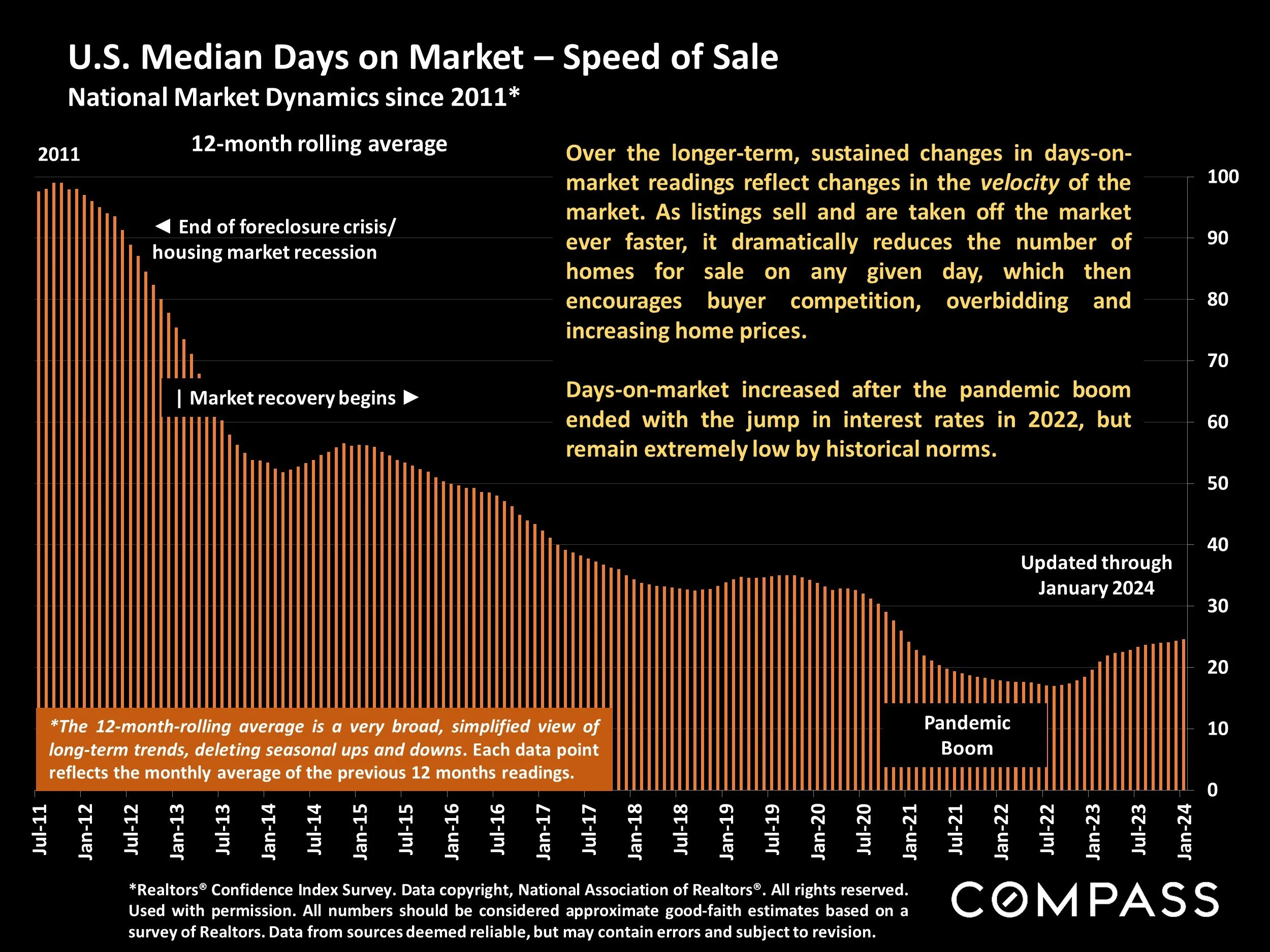 Days-on-market increased after the pandemic boom ended with the jump in interest rates in 2022, but remain extremely low by historical norms.
