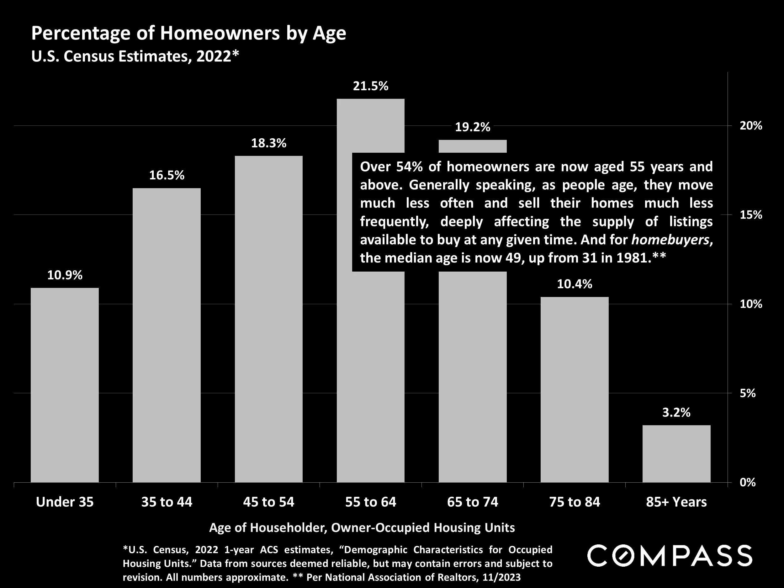 Over 54% of homeowners are now aged 55 years and above. Generally speaking, as people age, they move much less often and sell their homes much less frequently, deeply affecting the supply of listings available to buy at any given time. And for homebuyers, the median age is now 49, up from 31 in 1981.**