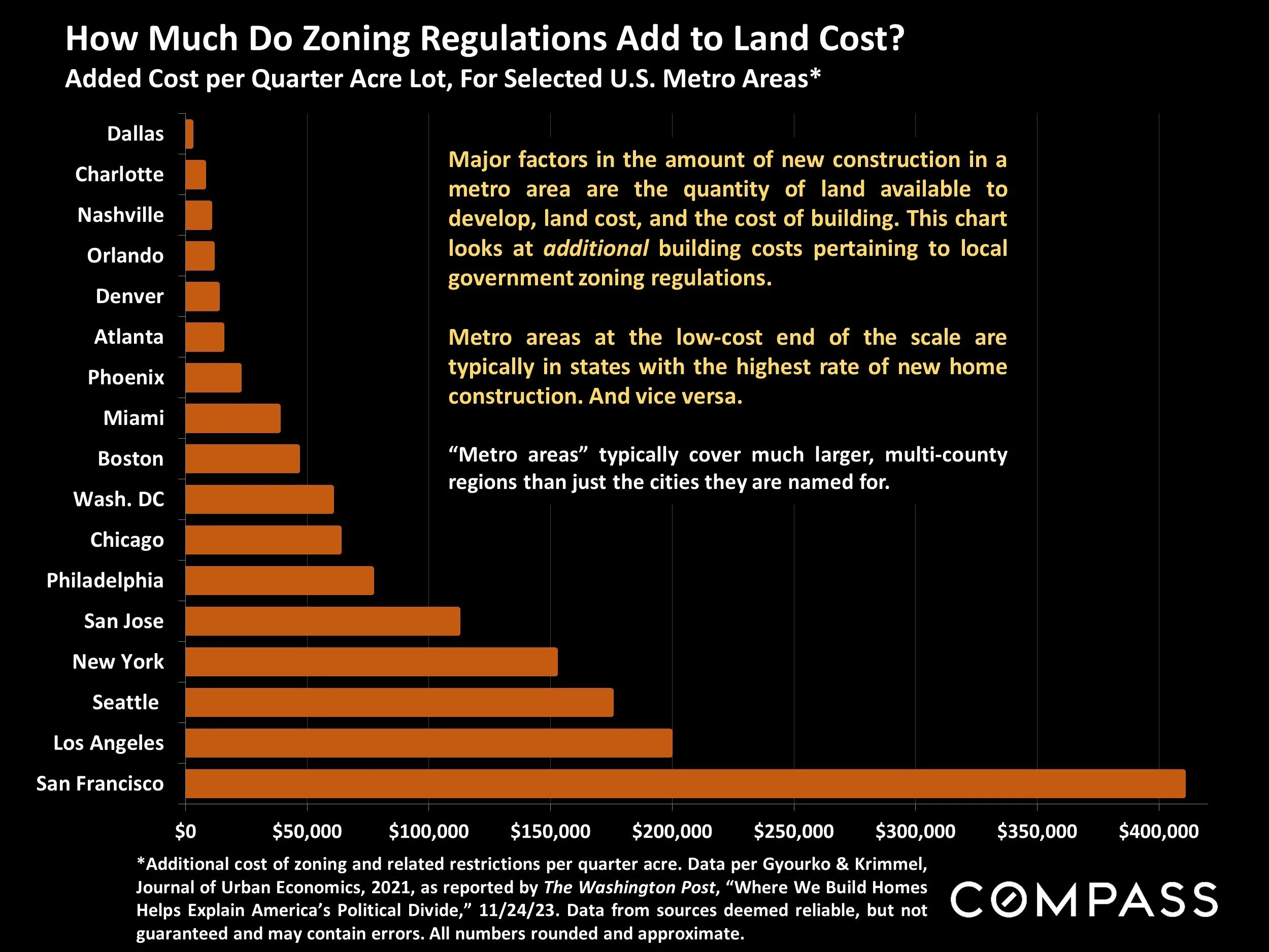 *Additional cost of zoning and related restrictions per quarter acre. Data per Gyourko & Krimmel, Journal of Urban Economics, 2021, as reported by The Washington Post, “Where We Build Homes Helps Explain America’s Political Divide,” 11/24/23. Data from sources deemed reliable, but not guaranteed and may contain errors. All numbers rounded and approximate.