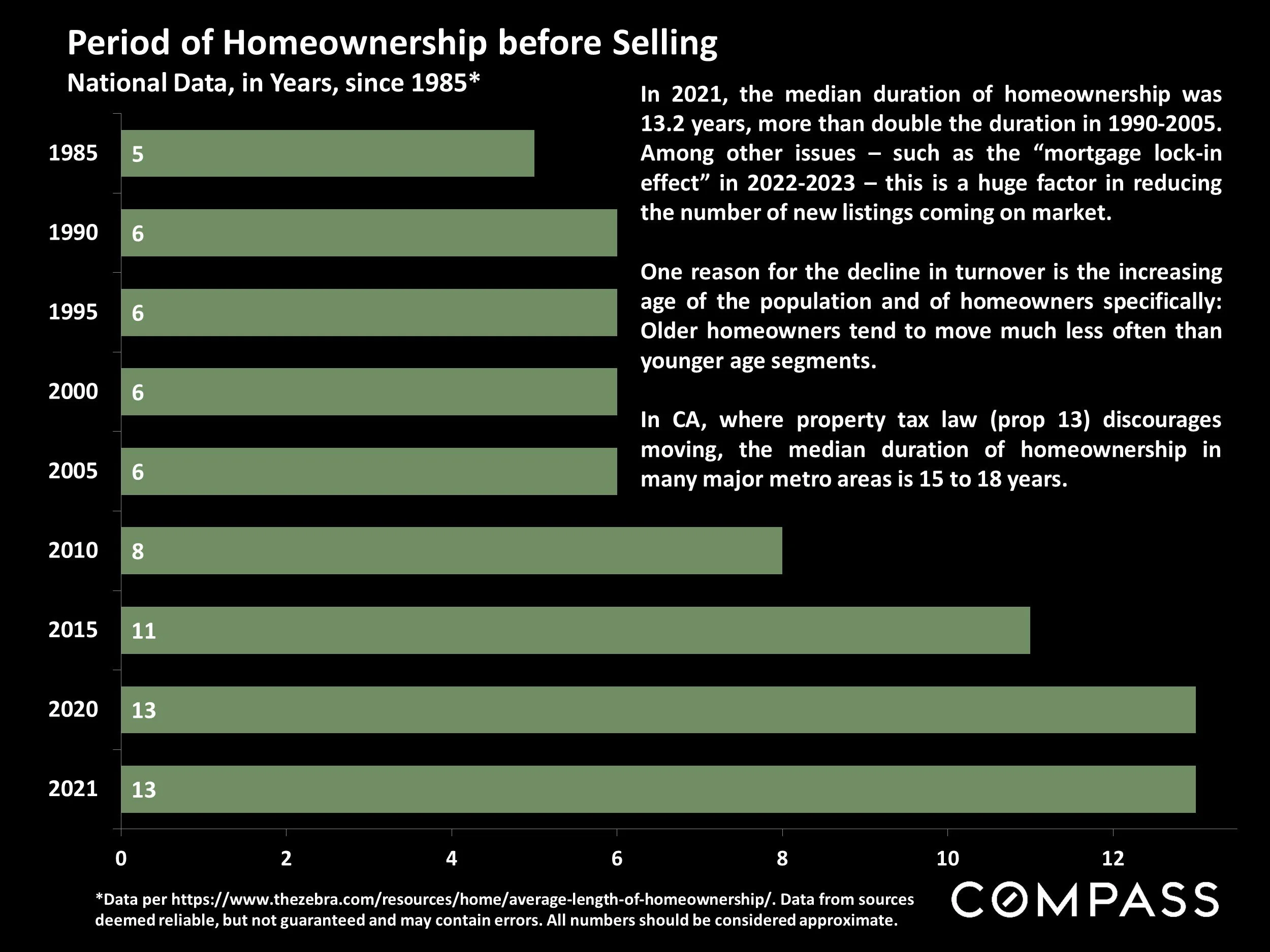 In CA, where property tax law (prop 13) discourages moving, the median duration of homeownership in many major metro areas is 15 to 18 years.